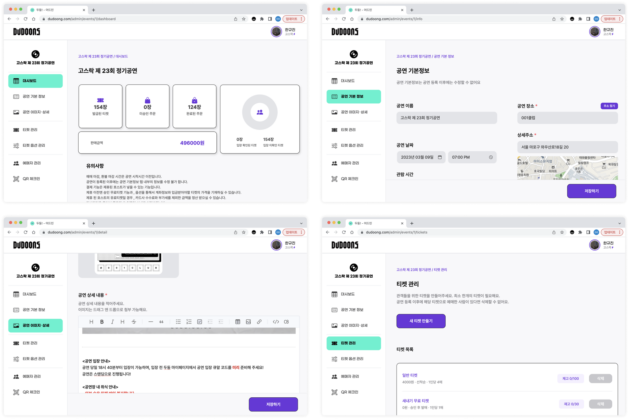 ์ด๋ฉ์ผ๋ก ํธ์คํธ์ ํ์๋ค์ ์ด๋ํ ์ ์๊ณ , ํฐ์ผ ์ฃผ๋ฌธ ์์ ์ฌ๋์ผ๋ก ์๋ฆผ์ ๋ฐ์ ์ ๋ ์๋ค. ๊ตฌ๋งค์๋ค์ด ์ต์ ์ ์์ฑํ ์๋ต๋ค๋ ์๋งค์ ๊ด๋ฆฌ์์ ์ ๋ฆฌ๋ ํ๋ฉด์ผ๋ก ๋ณผ ์ ์๋ค. ๊ณต์ฐ ๊ด๋ฆฌ์์๋ ํ์ฌ ํฐ์ผ ์ฃผ๋ฌธ๊ณผ ์ ์ฅ ํํฉ์ ๋์๋ณด๋์์ ํ์ธํ ์ ์๊ณ , ๊ณต์ฐ ์์ธ ๋ด์ฉ ๊ฐ์ ์ ๋ณด๋ค์ ๋ฑ๋กํ๊ณ ์์ ํ๋ค. ํฐ์ผ๊ณผ ์ต์ ๊ด๋ฆฌ ํ๋ฉฐ ๋ ์์ ์๋ ์์งค์.