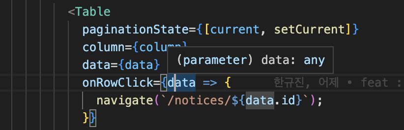 ํ ์ด๋ธ ๊ฐ ํ์ ํด๋ฆญํ์ ๋ ์คํ๋๋ ์ฝ๋ฐฑ ํจ์์, ์ธ์๋ก ๊ฐ ํ์ data๊ฐ ์ ๋ฌ๋๋๋ก ํ๋ค.