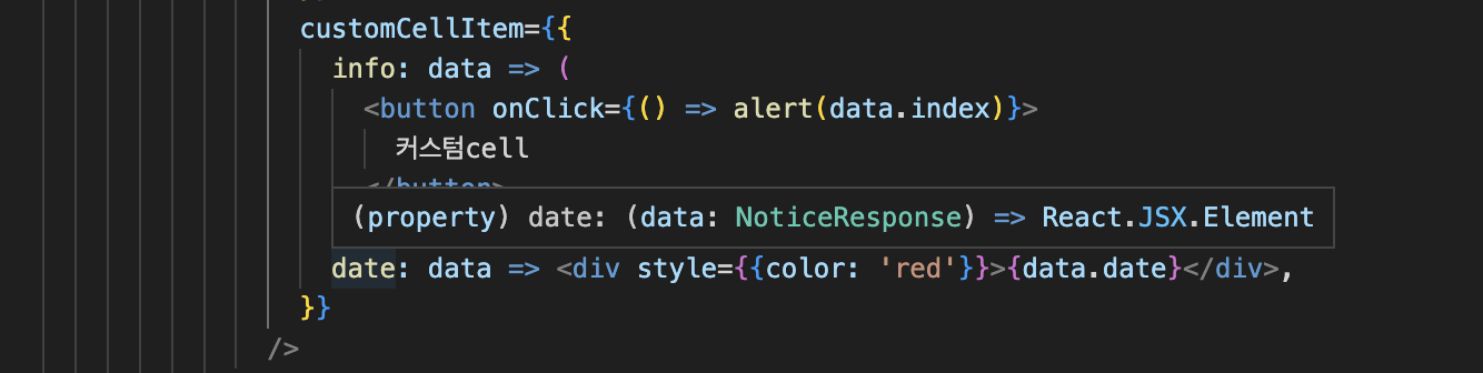 customCellItem์ ์ํ getCustomRow ํจ์์ด๋ค. ์ธ์๋ก ๋ฐ์ ๊ฐ์ฒด์ ์๋ ์์ฑ๊ณผ ๊ฐ์ ํค๋ฅผ ๊ฐ์ง ์ปฌ๋ผ์ ์ปดํฌ๋ํธ๋ฅผ ๋ฐํํ๋ ํจ์๋ก ๋์ฒด๋๋ค.