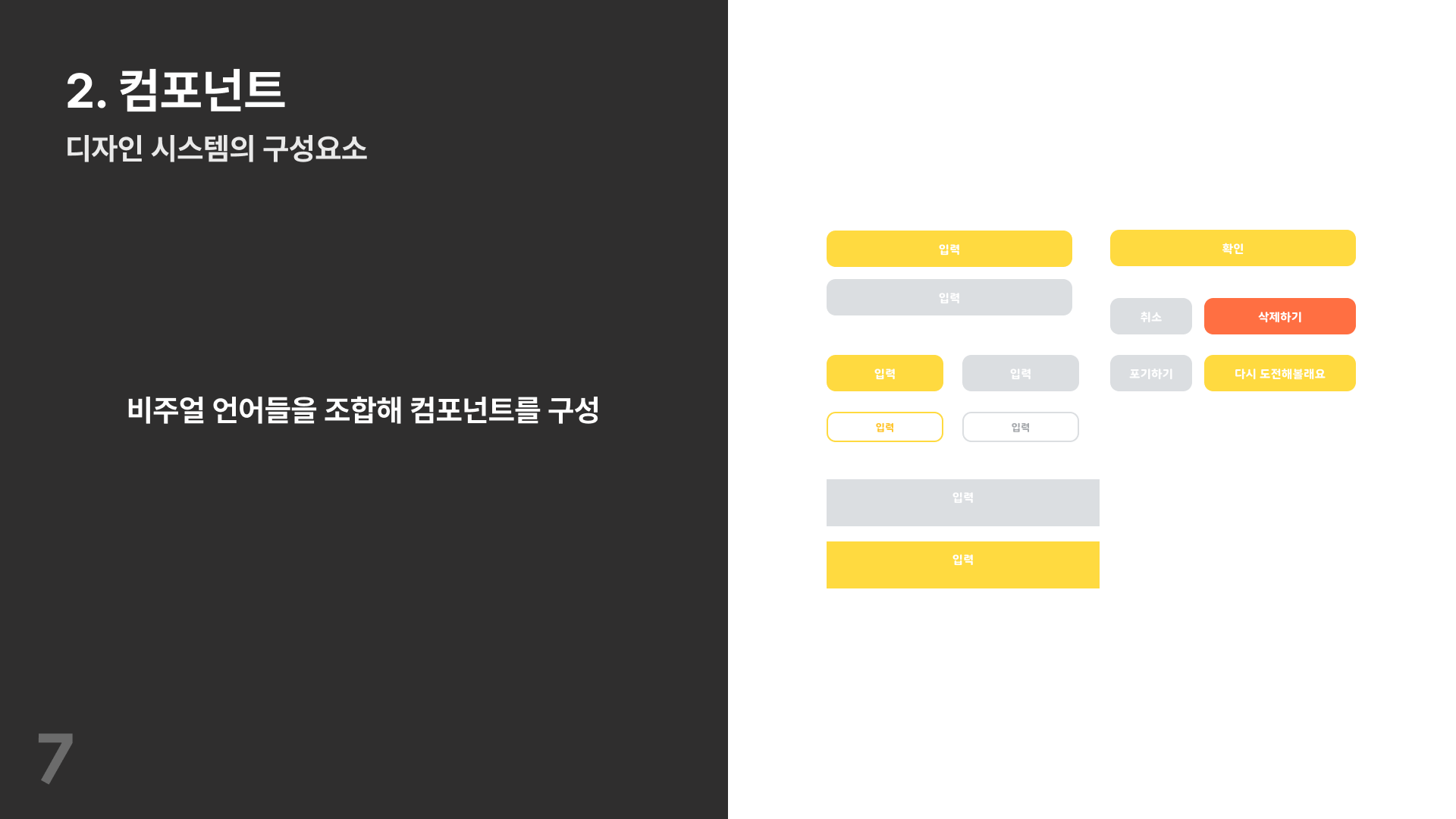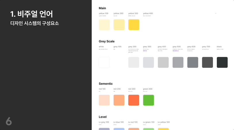 ๋จผ์ ๋น์ฃผ์ผ ์ธ์ด๋, UI๋ฅผ ํํํ ์ ์๋ ๋ค์ํ ์์๋ค์ ๋งํฉ๋๋ค. ์๋น์ค์ ์ฌ์ฉํ๋ ๋ชจ๋ ์์๋ค์ ์ด๋ ๊ฒ ๊ท๊ฒฉํํฉ๋๋ค. ๋ฉ์ธ ์์์ Yellow100, 200, 300 ๋ฑ์ผ๋ก ๋ผ๋ฒจ๋ง์ ํ์ต๋๋ค. ๊ฐ์ฅ ๋ง์ ๊ณณ์์ ์ฌ์ฉํ๋ ๋ชจ๋ ธํค ์์๋ ๋ง์ฐฌ๊ฐ์ง์ ๋๋ค.