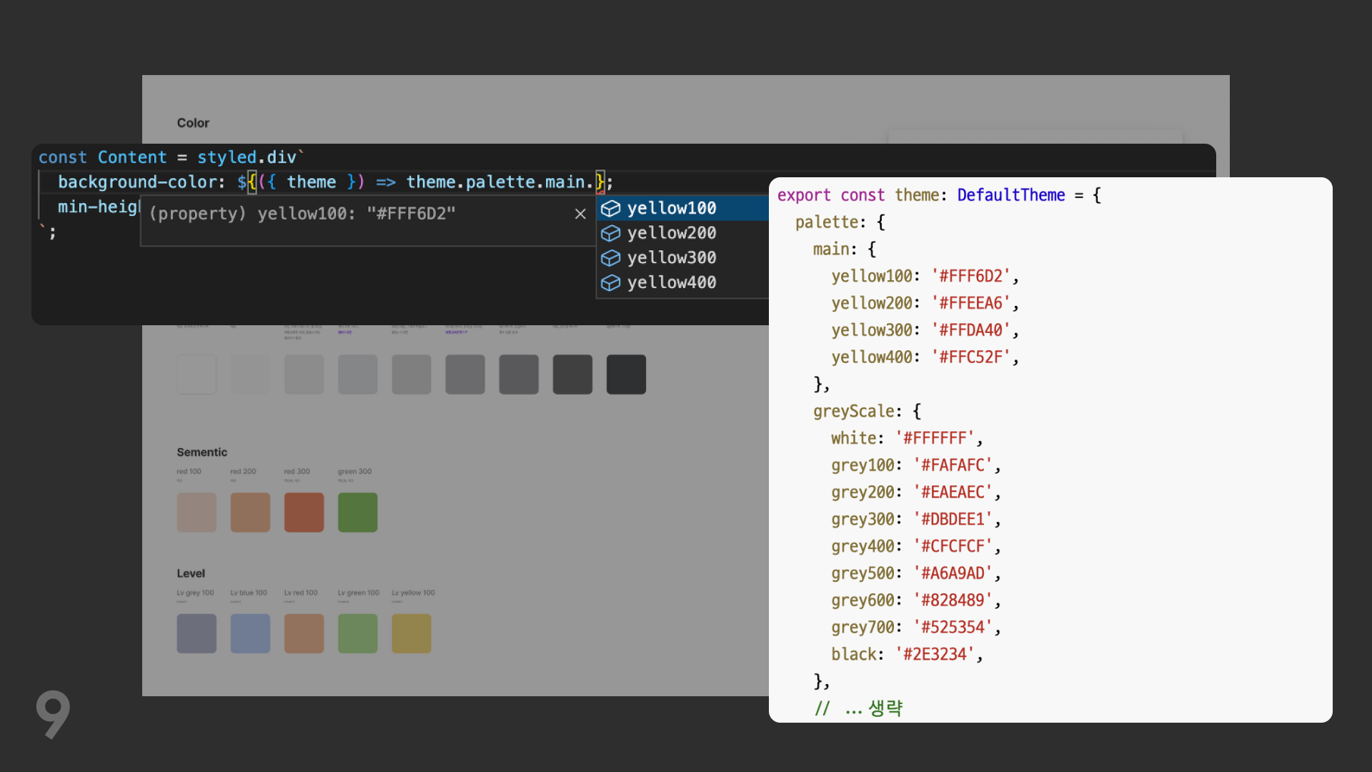 ์ด๋ฅผ ํ๋ก ํธ์๋, ๋ฆฌ์กํธ ๋จ์๋ ๊ทธ๋๋ก ๋๊ณ ์ค๊ธฐ ์ํด์ ‘styled-components’๋ฅผ ์ฌ์ฉํ๊ณ ์์ต๋๋ค. css๋ฅผ js ๊ตฌ๋ฌธ ์์์ ์ธ ์ ์๋๋ก ํด์ฃผ๋ npm ๋ผ์ด๋ธ๋ฌ๋ฆฌ์ ๋๋ค. ๊ทธ ์ค์์ ‘Theme provider’๋ผ๋ ๊ธฐ๋ฅ์ ํ์ฉํ ๊ฒ๋๋ค. ์คํ ์ธ๋ฏธ๋์ธ ๋งํผ ์ฝ๋๋ฅผ ๊น์ด ์ค๋ช ๋๋ฆฌ์ง ์๊ฒ ์ง๋ง ๋์ถฉ ๋ด๋ ์์ค๊ฒ๋๋ค. #FFF6D2์ ๊ฐ์ ์์ ์ฝ๋๋ค์ yellow100 ๋ฑ์ key๋ก ํ๋ ๊ฐ์ฒด๋ก ๋ง๋ค์ด๋๊ณ , ํด๋น ๊ฐ์ฒด๋ฅผ ํ๋ก์ ํธ ์ปดํฌ๋ํธ ์ ์ฒด์ ์ ์ญ์ ์ผ๋ก ์ฌ์ฉํ ์ ์๋๋ก ์ธํ ํด๋ก๋๋ค. ๊ทธ๋ผ css ๊ตฌ๋ฌธ ๋ด์์ ๋ถ๋ฌ์ ๋ฐ๋ก ์ฌ์ฉํ ์ ์์ต๋๋ค. ํ์ ์คํฌ๋ฆฝํธ์ ๊ฐ์ด ์ฌ์ฉํ๋ค๋ฉด ์ผ์ชฝ ์ฌ์ง์ฒ๋ผ ์๋์์ฑ์ผ๋ก ๋ฐ๋ก ์ ๋ ฅํ ์ ์์ต๋๋ค.