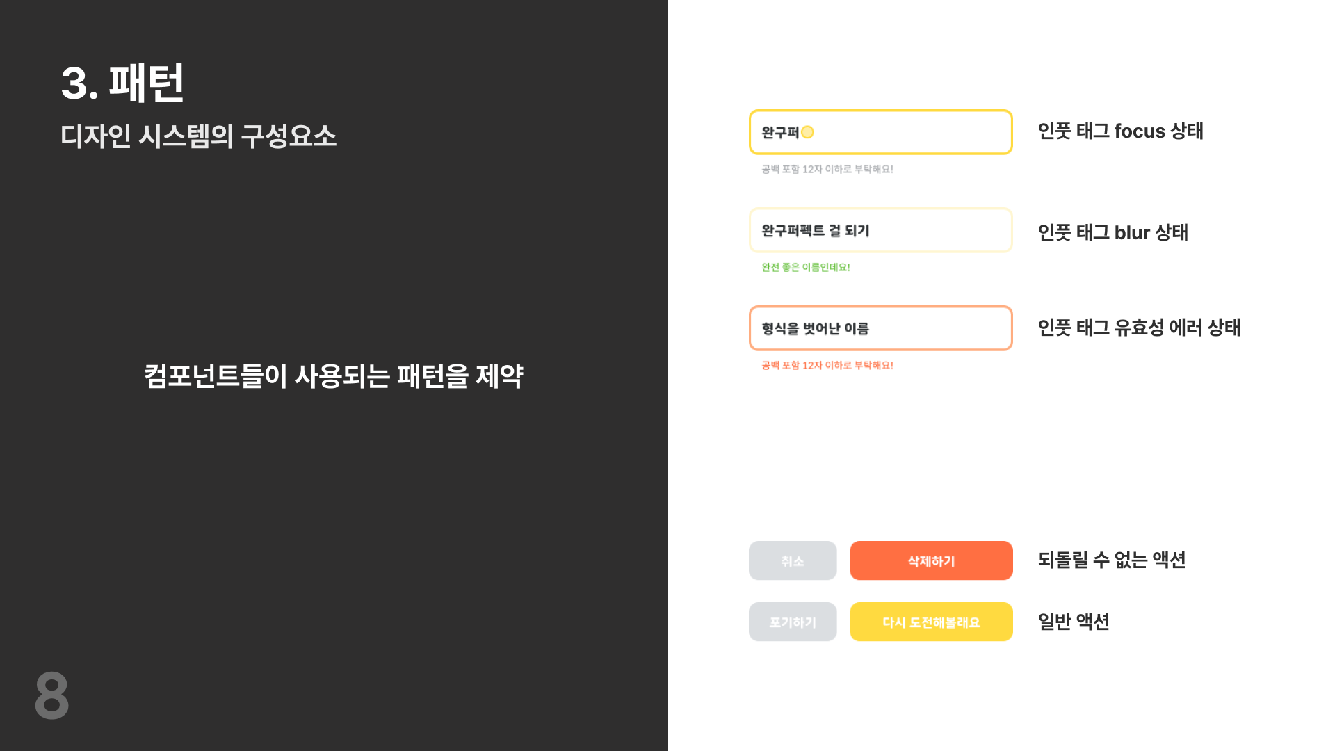 ์ฌ๋ผ์ด๋์ ์๋ ๊ทธ๋ฆผ์ ์ธํ์ฐฝ ์ปดํฌ๋ํธ์ ๋๋ค. focus๋์ด์์๋๋ ์งํ ๋ ธ๋์์, blur์ผ๋๋ ํ๋ฆฌ๊ฒ ํด์ค๋๋ค. ์ ํจ์ฑ ๊ฒ์ฌ๋ฅผ ํต๊ณผํ์ง ๋ชปํ์ ๋๋ ๋นจ๊ฐ์์ผ๋ก ๊ฒฝ๊ณ ๋ฅผ ๋์ฐ๋๋ก ํฉ๋๋ค. ๋ฒํผ ์ปดํฌ๋ํธ๋ ๋ง์ฐฌ๊ฐ์ง์ ๋๋ค. ๋๋๋ฆด ์ ์๋ ์ก์ ์ ์คํํ๋ ๋ฒํผ์ ๋นจ๊ฐ์์, ๊ทธ ์ธ ๊ธฐ๋ณธ๊ฐ์ผ๋ก ์๋น์ค์ ๋ฉ์ธ ์ปฌ๋ฌ๋ฅผ ์ฌ์ฉํฉ๋๋ค.